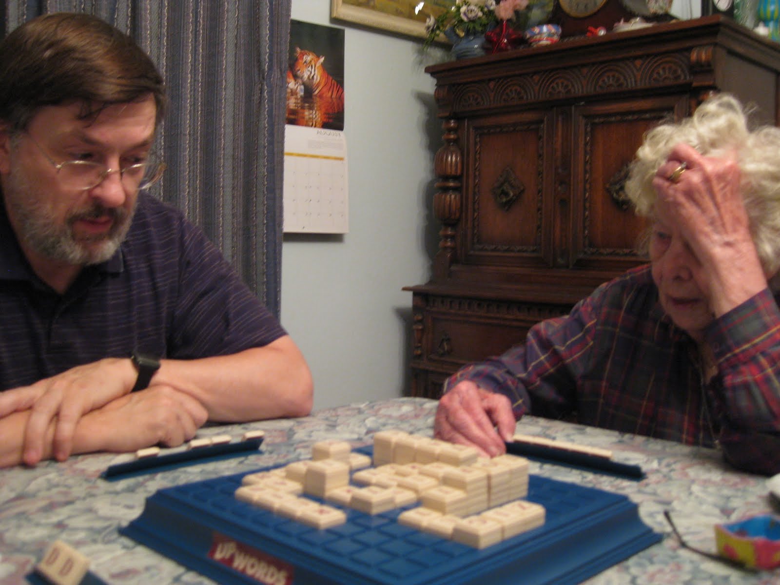 Upwords battle ca. 2009. My (then) 92yo grandmother still wipes the floor with us. |